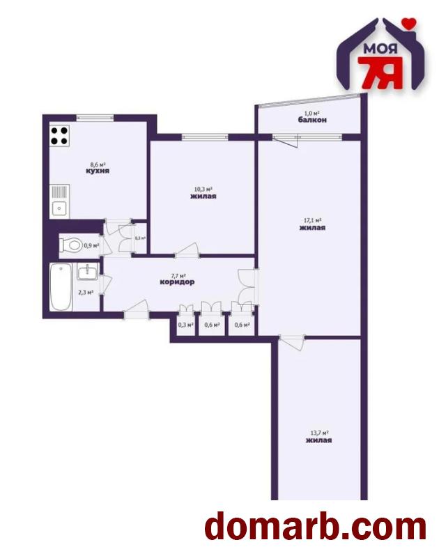 - Общая площадь квартиры составляет 64,4 м2, из которых 41,1 м2 — жилая площадь. Состоит из трёх просторных комнат, площадью 17,1 м2, 13,7 м2 и 10,3 м2 соответственно.