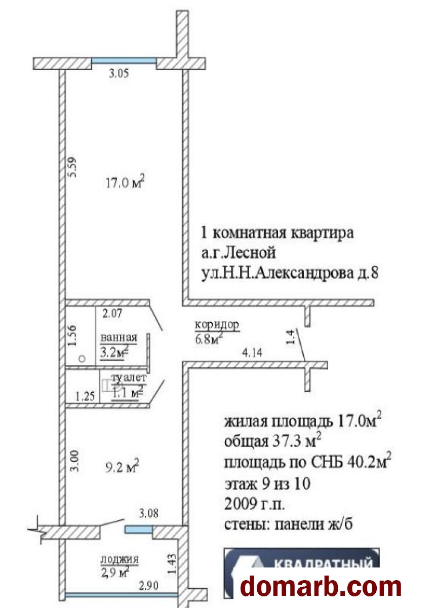 Общая площадь квартиры составляет 37,3м2, площадь по СНБ 40,2, жилая площадь 17,0м2, площадь кухни 9,2м2.