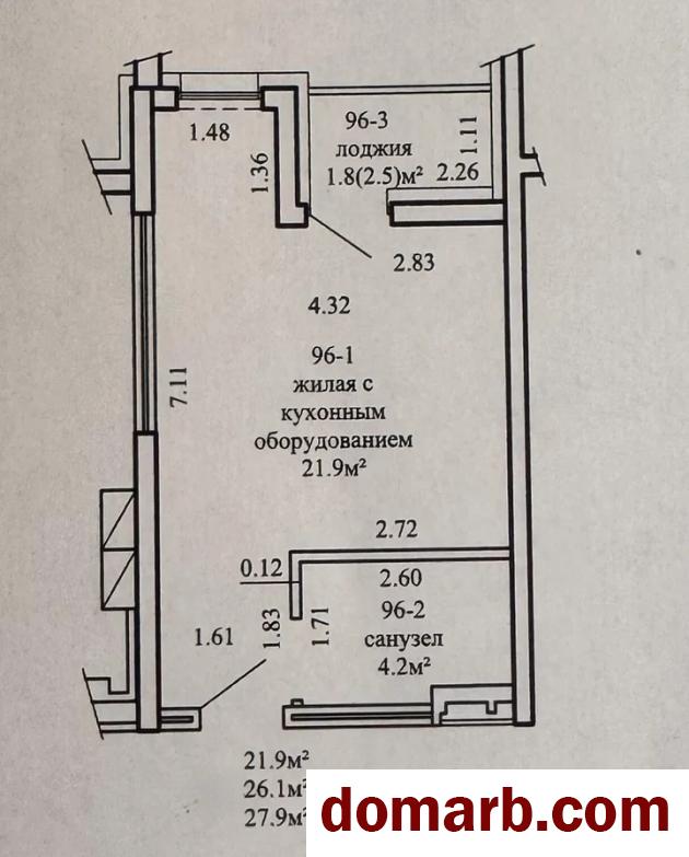 - Общая площадь 26,1 кв.м., по СНБ 27,9кв.м., жилая 21,9 кв.м.