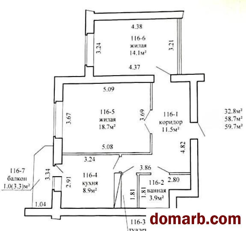 Площадь по СНБ 59,7 м2, общая – 58,7 м2, жилая –32,8 м2, кухня - 8,9 м2, гостиная – 18,7 м2. изолированная комната – 14,1 м2, совмещенный санузел 3,9 м2, прихожая – 11,5 м2 с большим встроенным шкафом.