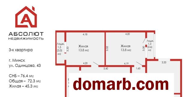 Площадь общая по СНБ 76.4 / жилая 45.3 / кухня 9.4 кв.м. Высота потолков - 2.51 м, 5-й этаж.