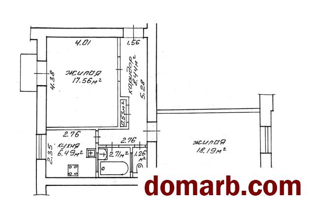 Общая площадь - 55,18м2; жилая – 35,75м2, включает в себя две большие комнаты 18,19м2 и 17,56м2; кухня – 6,49м2. Санузел раздельный.
