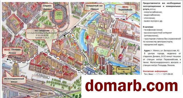 В центре города сдаются в аренду офисы: 38 м.кв., 20 м.кв., 15.6 м.кв. (свободная бесплатная стоянка).nВозможна аренда складов 20 м.кв., 64 м.кв., 69 м.кв. (отапливаемый склад, отдельный вход, вентиляция, подведены телефон и интернет, подходит для организации небольшого производства).nnВсе помещения расположены на одной территории.nПри аренде офис+склад возможно предоставление скидок.nСвободный режим работы: 24ч., в т.ч. и в выходные.nnНа время аренды предоставляются:n- просторная бесплатная стоянка без ограничений по количеству автотранспорта;n- высокоскоростной интернет (оптоволокно);n- телефонные номера;n- юридический адрес.nnПредоставляются все эксплуатационные и коммунальные услуги, в т.ч.: энергоснабжение, отопление, водоснабжение, вывоз мусора и пр.nnАдрес: г. Минск, ул. Белорусская, 41 (в центре города; недалеко от стадиона Динамо; 8-10 минут пешком от станции метро Первомайская, а также Железнодорожного вокзала и ст. метро Площадь Ленина)