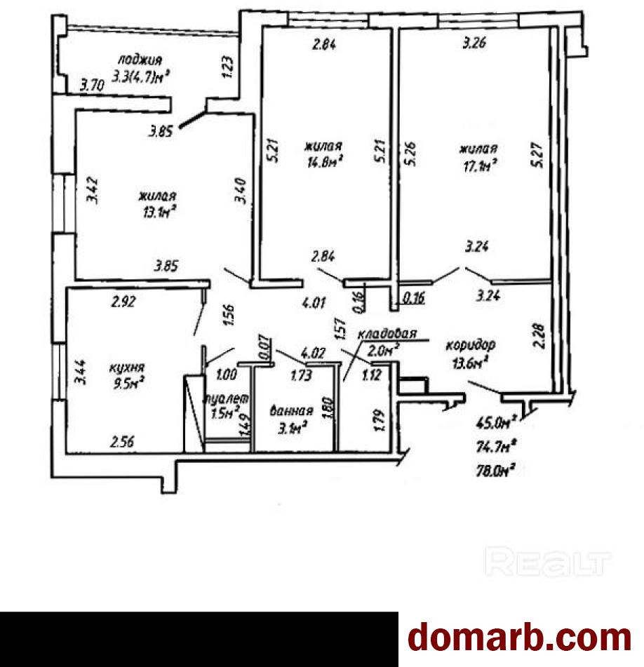 Рациональная планировка: 3 раздельные комнаты: 17,1м.кв, 14,8м.кв., 13,2м.кв., кухня 9,5м, застекленная лоджия 4,7м.кв, раздельный санузел. Имеется кладовая - 2,0м.кв.