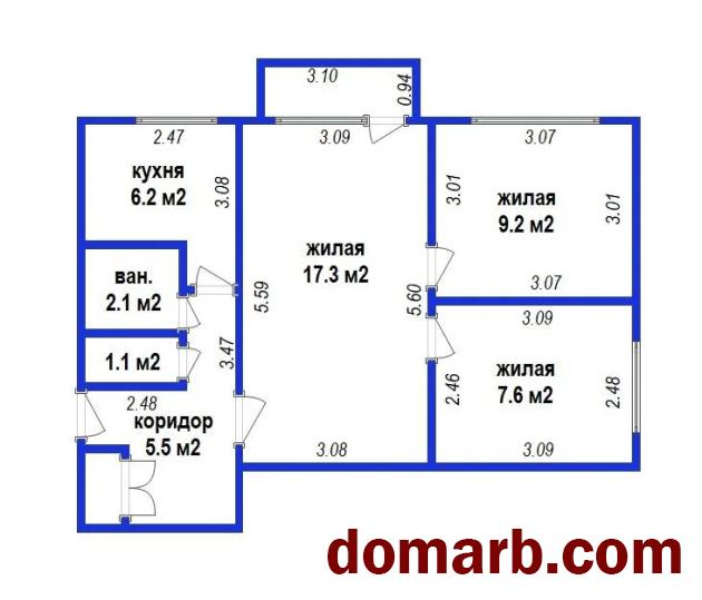 2 комнаты раздельные по 9 м 2 и 7.6 м2 и одна проходная 17.3 м2