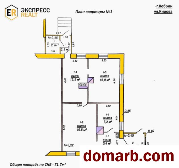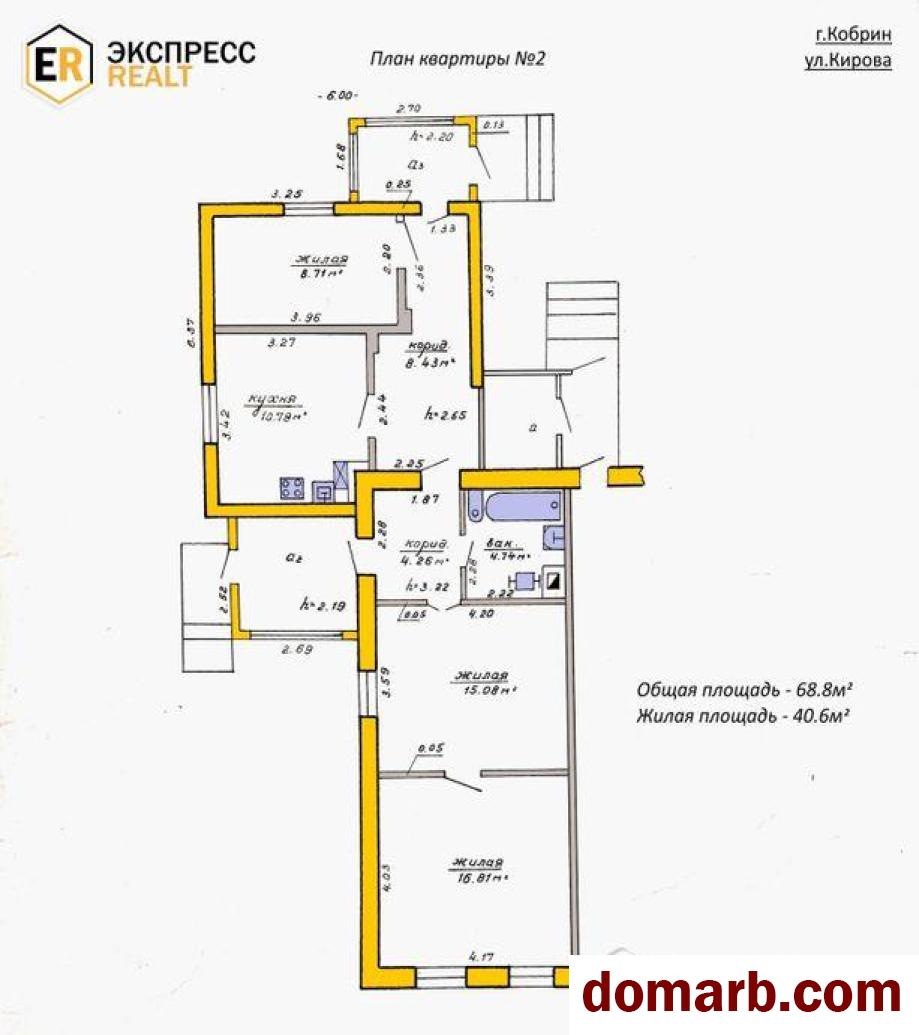 Продаётся двухквартирный блокированный жилой дом в центре Кобрина. Жилой дом состоит из двух выделенных трёхкомнатных квартир общей площадью 129.7 кв.м. nДом одноэтажный, 1890 года постройки. Наружные стены - керамический кирпич, перекрытие - деревянное, фундамент – бутовый ленточный, кровля - шифер, полы - дощатые, межкомнатные двери - деревянные, окна - деревянные и из ПВХ-профиля.nКвартира №1: общая площадь - 60.9 кв.м., жилая – 43.0 кв.м. В квартире три жилые комнаты и две кухни (12.5 и 5.4 кв.м.), также есть две холодные пристройки. Инженерные коммуникации: газ - централизованный (введён в дом), отопление - печное, электроснабжение - центральное, водопровод и канализация - центральные (по улице).nКвартира №2: общая площадь - 68.8 кв.м., жилая – 40.6 кв.м. В квартире три жилые комнаты, два коридора, совмещённый санузел и кухня 10.8 кв.м., также есть холодная пристройка и веранда. Инженерные коммуникации: газ - централизованный, отопление – на газу от котла, электроснабжение - центральное, водопровод и канализация - центральные.nЗемельный участок площадью 6.4 сотки, ровный, огорожен по периметру, с хорошими асфальтированными подъездными путями. На участке расположены несколько сблокированных деревянных сараев и уборная, есть огород. Дом находится в частном секторе в исторической части Кобрина, в 10 мин ходьбы от центра города. Рядом школа №2, сквер, набережная, продуктовый магазин, аптека, остановки общественного транспорта. Реальному покупателю – хороший торг при осмотре.nООО «Экспресснедвижимость-риэлт», УНП 193505113, лицензия 02240/409 от 05.03.2021 г., договор на оказание риэлтерских услуг 412/6 от 04.11.2024 г.