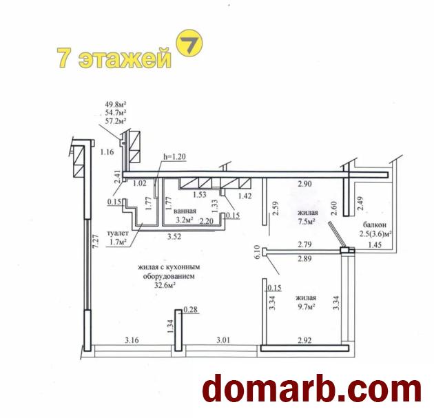 Площадь квартиры общая 54.7 кв.м, жилая 49.8 кв.м