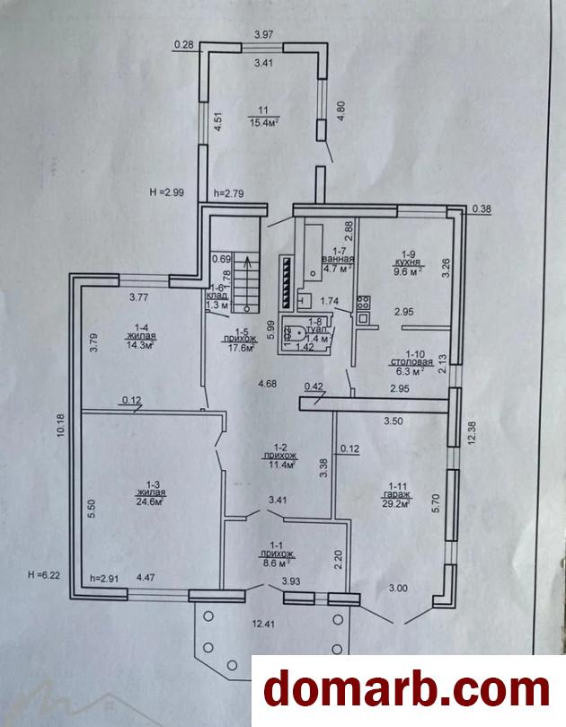 На 1-м этаже: кухня-столовая 15.3 м2, а также 2 жилые комнаты (14.3 и 24.6 м2), ванная 4.7м2 и туалет 1.4 м2, гараж 29.2 м2
