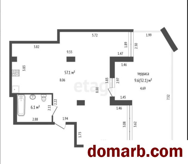 Площадь квартиры в объявлении указана по СНБ 72,3 кв.м. Общая площадь 63,2 кв.м., жилая - 57,1 кв.м.