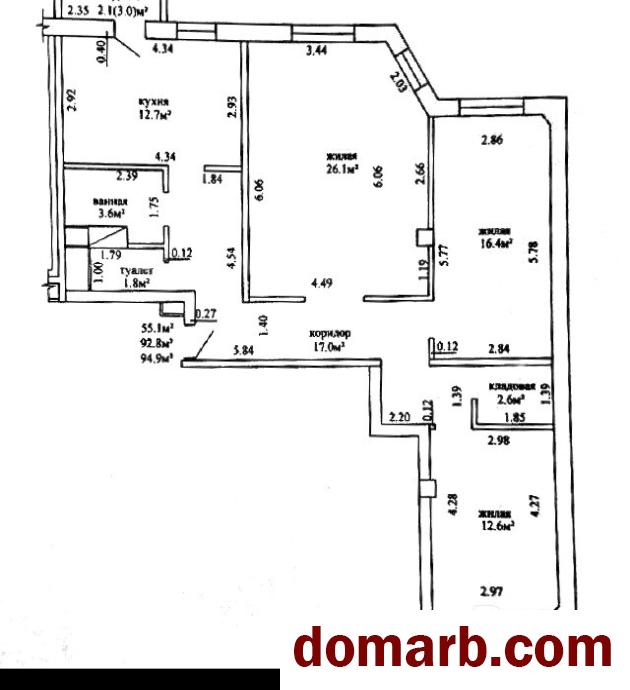 Площадь квартиры по СНБ 94,9 м2, комнаты 26,1 м2, 16,4 м2, 12,6 м2, кухня 12,7 м2.