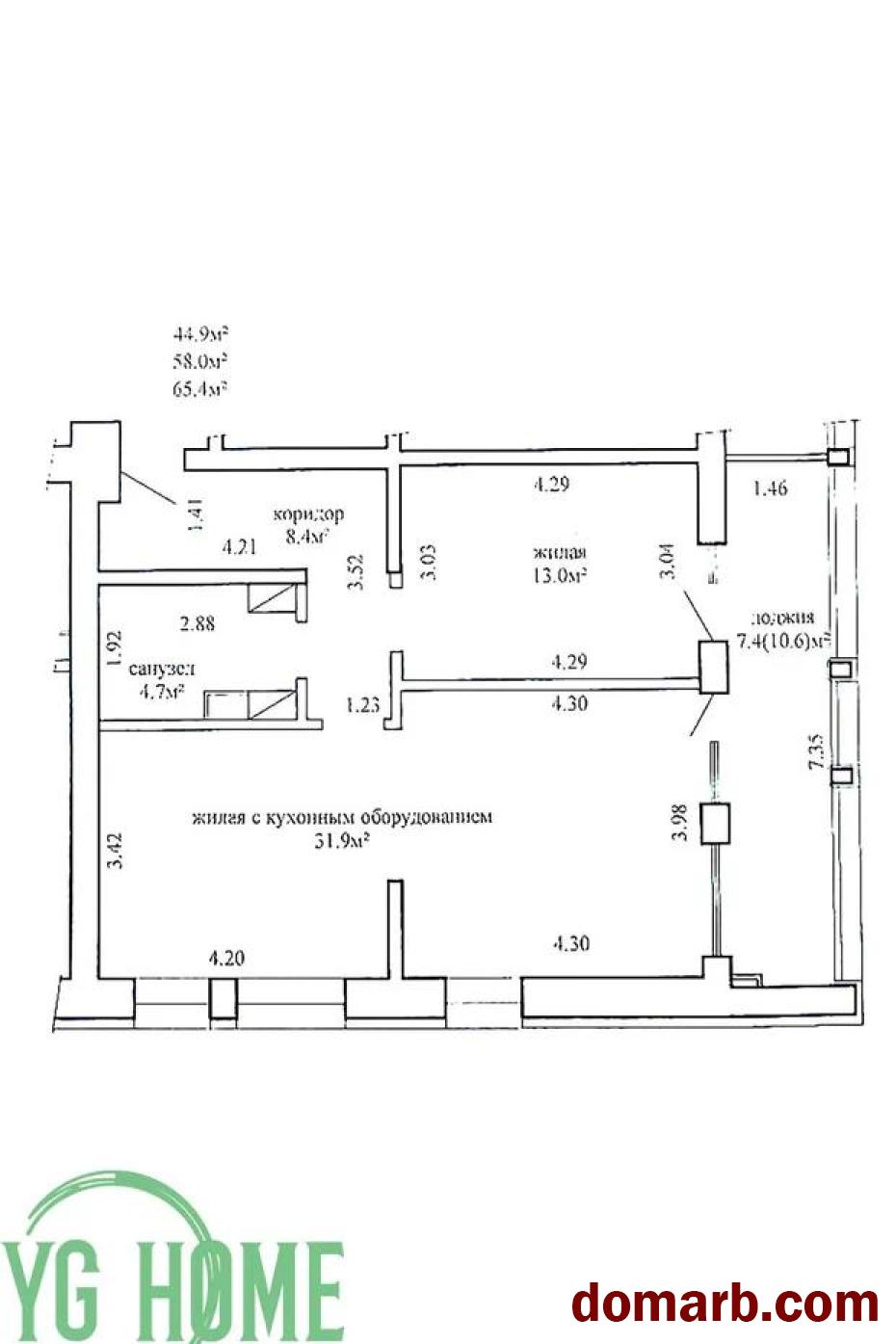 Площадь по СНБ- 65,4 м2, общая площадь 58 м2, жилая 44,9 м2.
