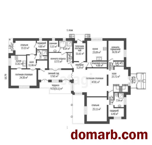 Основной жилой дом состоит из двух жилых зон (74 м2) и (379 м2), имеющих отдельные входы, и объединённых зимним садом (19 м2), из которого есть вход в спа-зону с комнатой отдыха, ванной комнатой и хаммамом (33 м2), а также выход на летнюю террасу (23 м2) с выходом во внутренний двор. Таким образом, в доме, не нарушая границ друг друга, могут жить две семьи