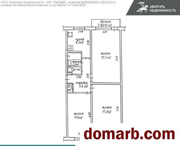 Общая площадь квартиры 61,6 кв.м. Удобная планировка: все комнаты раздельные (17,2, 17,3, 11,5м2), раздельный санузел, окна выходят на обе стороны дома, есть балкон.