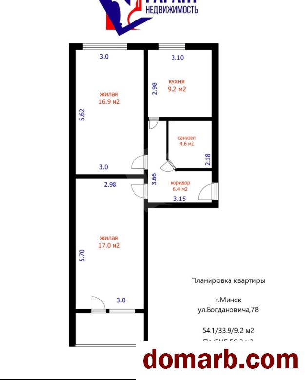 Комфортная планировка: «Улучшенный проект» с двумя раздельными комнатами (33.9 м2) и просторной кухней 9.2 м2. Площадь по СНБ составляет 56.2 м2.