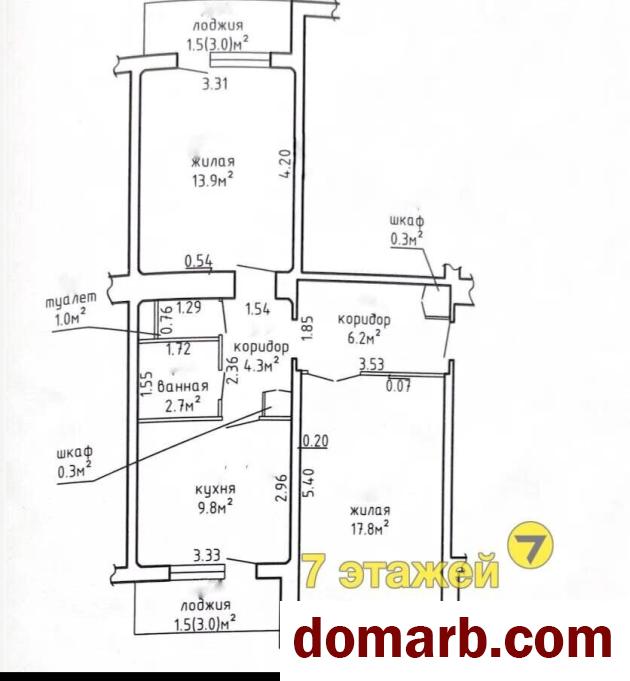 Общая площадь 59,2 м2 (по СНБ), жилая 56,2 м2. Комнаты 17,8 м2 и 13,9 м2 (окна выходят на разные стороны, хорошая освещённость и проветриваемость).